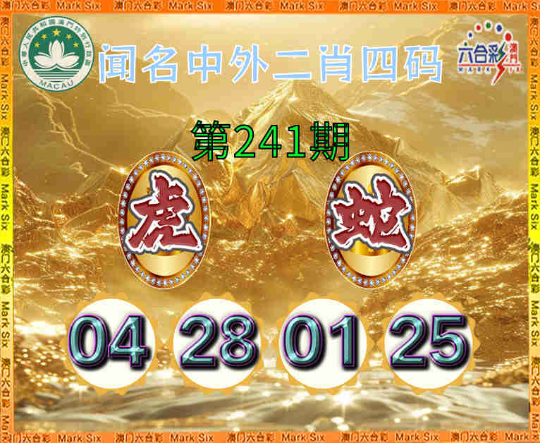 241期:『闻名中外』 🧣二肖四码🧣【虎】【04.28.01.25】开:蛇01